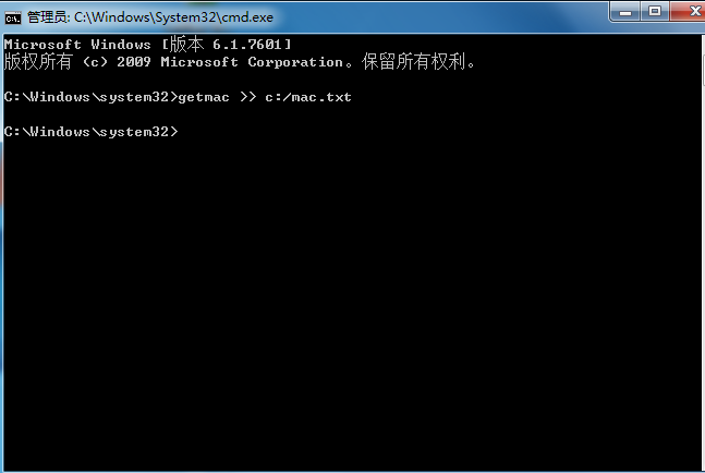 在已管理员权限运行CMD窗口后,在窗口输入“getmac >> c:/mac.txt” 命令 ,按回车键